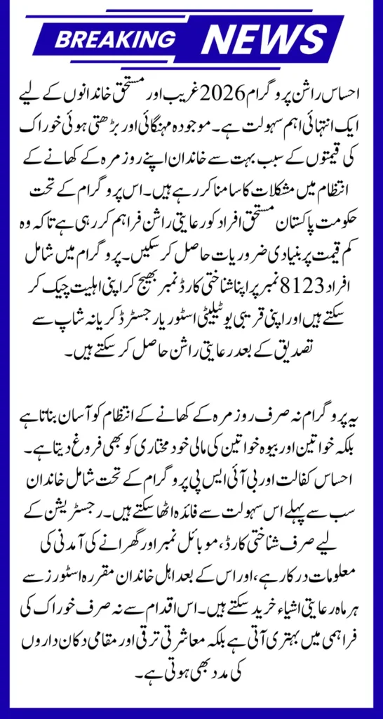 The 8123 Ehsaas Rashan Program 2026 has become a critical support system for Pakistan’s most vulnerable families. It ensures access to essential food items at subsidized rates, alleviating the financial burden caused by rising food prices. By empowering women and supporting local shops, the program not only improves food security but also promotes community development.