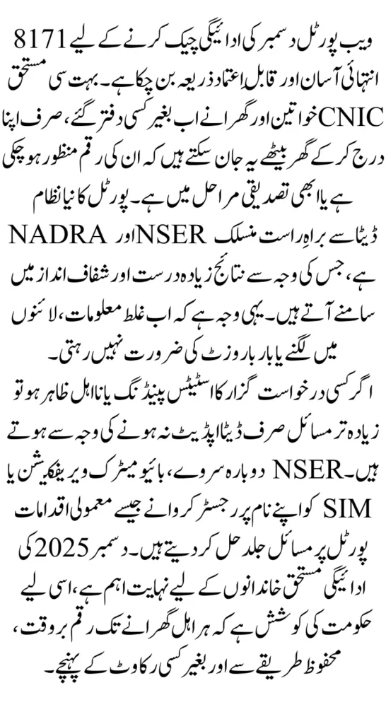 The 8171 December Payment Check system provides the most reliable way for beneficiaries to confirm their payment status without visiting any office. With simple access to the 8171 web portal and an updated CNIC and NSER record, families can confidently check whether their payment is approved or requires additional verification. This guide ensures you understand every step clearly and can complete the entire process with ease and accuracy.