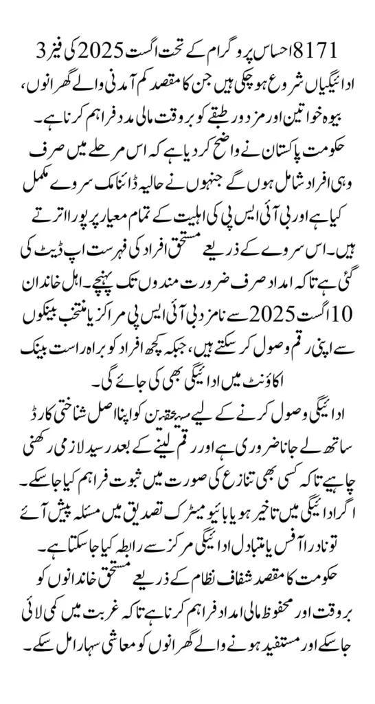 Phase 3 of the 8171 Ehsaas Program is a continuation of the government’s poverty reduction strategy. It focuses on transparent distribution, quick processing, and digital verification of beneficiaries to prevent fraud. Unlike previous phases, this cycle includes many families that recently registered through the dynamic survey in 2024–2025. Payments are being made available through designated BISP centers and selected banks, ensuring beneficiaries have multiple options for collection. The initiative also addresses common payment issues and offers solutions for smoother disbursement.