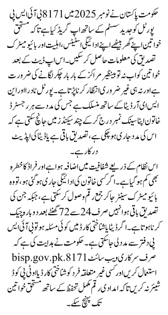 8171 November 2025 Update Verification for BISP beneficiaries has brought a major improvement to how families check eligibility, confirm status, and withdraw payments. Earlier, women had to rely heavily on SMS alerts or personally visit designated centers just to know whether their installment was released or still under verification. This caused delays, unnecessary travel, and confusion for thousands of low-income households. With the upgraded system, beneficiaries now have easy access to real-time verification through the official 8171 web portal, allowing instant confirmation of CNIC status, payment release, and biometric requirements all from home using a mobile phone. This digital upgrade is part of the government’s initiative to ensure transparency, reduce fraud, and provide a fast, accurate, and fair payment experience for every deserving Pakistani woman.