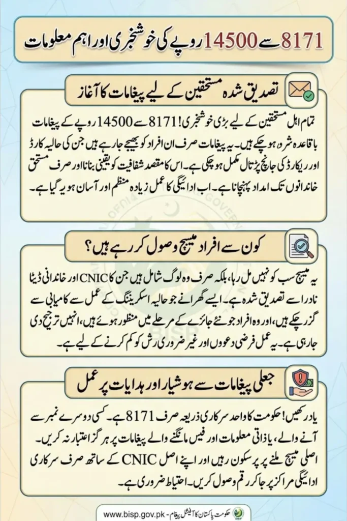 The government of Pakistan uses 8171 as its only official SMS channel for BISP communication. Any message claiming payment approval from another number should not be trusted, no matter how convincing it looks.