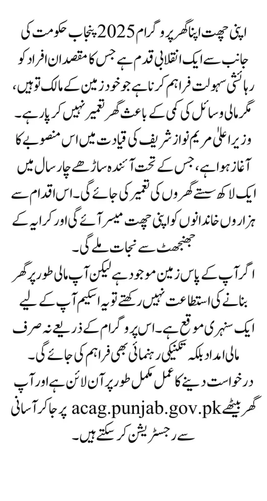 Apni Chhat Apna Ghar Program 2026 is one of the most ambitious housing schemes launched under the leadership of Chief Minister Maryam Nawaz Sharif. It targets thousands of low-income families in Punjab who are unable to afford homes of their own. With the rising cost of real estate and construction, many families struggle to move beyond rented homes. This initiative addresses that exact need by providing easy home loan options and housing support to people who already own a small plot of land but lack financial resources to construct a house.