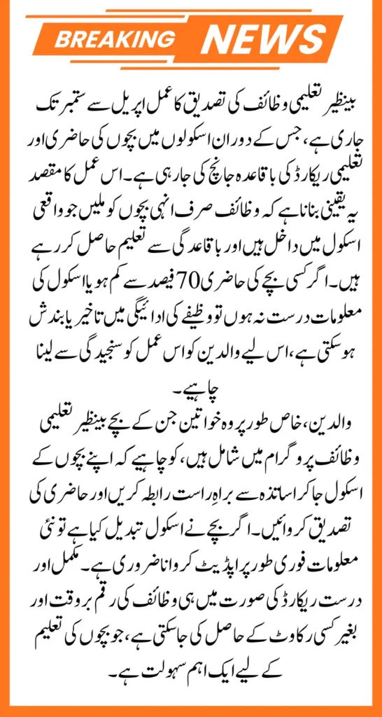 The Benazir Taleemi Wazaif verification process is designed to confirm that children receiving stipends are genuinely enrolled and attending school. Schools are verifying attendance registers, enrollment details, and class records before forwarding confirmations to the relevant authorities. This step helps prevent misuse and ensures deserving families continue to benefit.