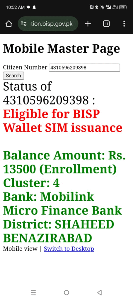 | Not Eligible | CNIC not in active beneficiary list | Visit nearest BISP office to update info |