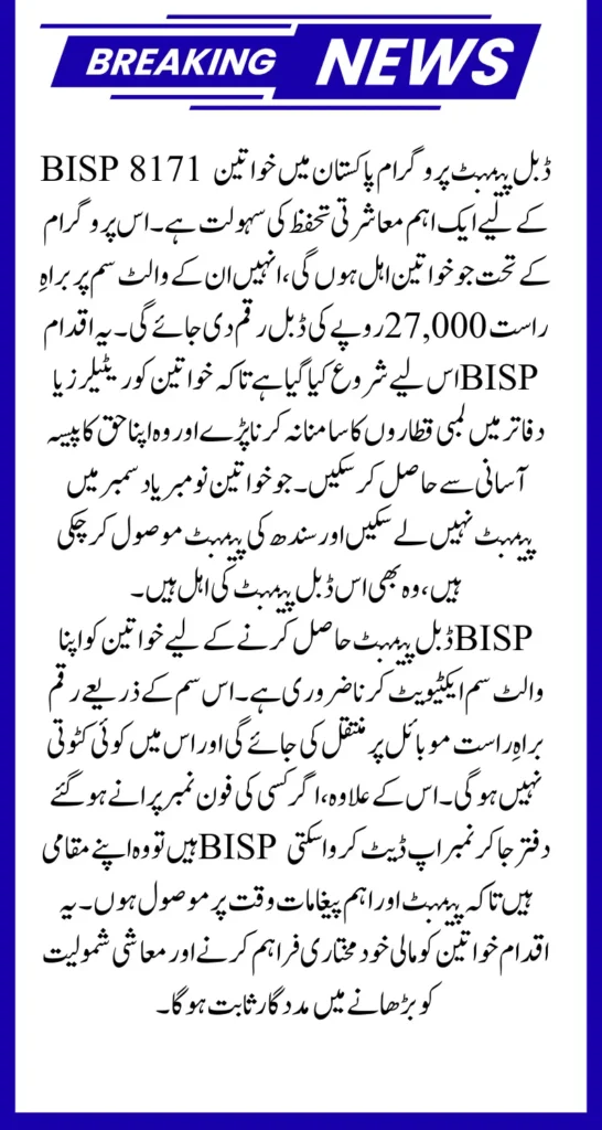 The BISP 8171 double payment initiative represents a significant step in supporting women beneficiaries in Pakistan. By providing ₨27,000 directly on Wallet SIMs, BISP ensures that financial aid is delivered securely, efficiently, and on time.