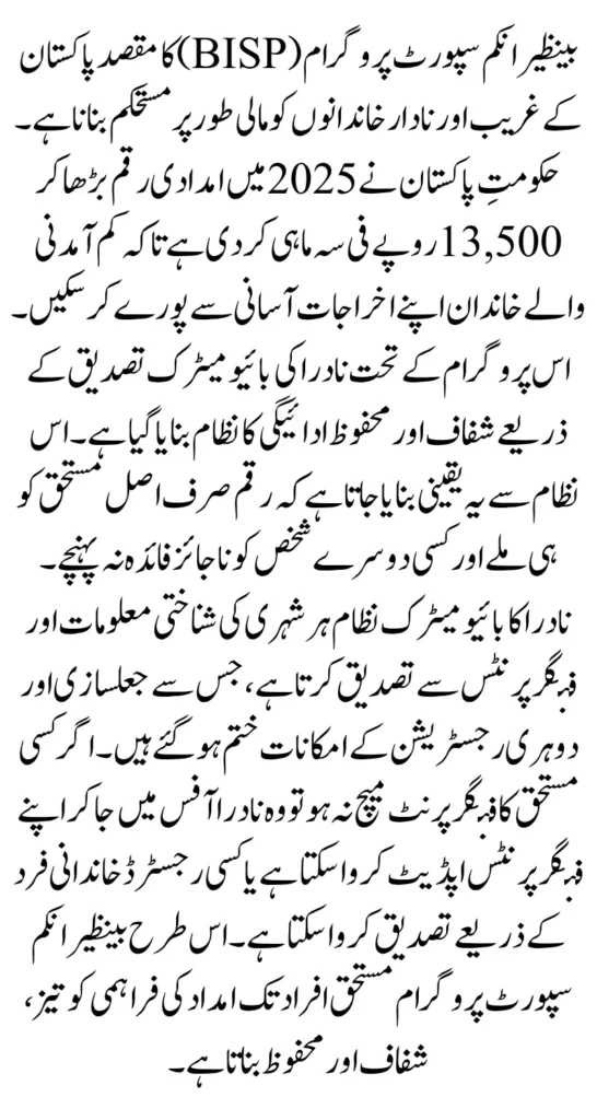 The integration of NADRA’s biometric verification with BISP has been a major step toward achieving digital transparency in Pakistan’s welfare system. This system guarantees that only genuine beneficiaries receive the quarterly Rs. 13,500 payment.