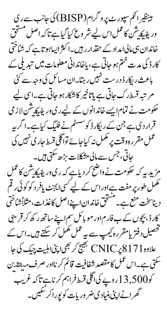 Moreover, the government has clearly linked the continuation of the Rs.13,500 quarterly payment with successful re-verification. Those who ignore the process risk being excluded from the beneficiary list until their information is corrected. This makes re-verification not only important but absolutely necessary for thousands of families who rely on BISP for their daily needs.