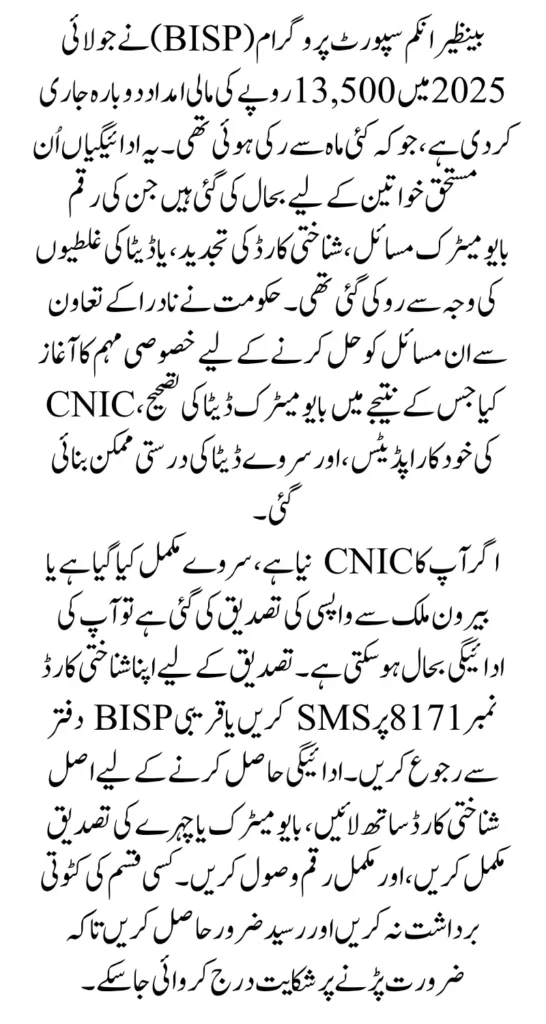The restoration of BISP 8171 payments in July 2025 is a strong step toward supporting low-income and vulnerable families in Pakistan. If your payment was stopped earlier this year due to biometric or documentation issues, now is the time to take action.