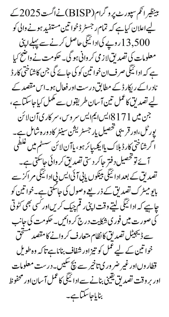 BISP 8171 Verification August 2025 is a lifeline for thousands of low-income families in Pakistan. For August 2025, the government has clearly stated that all registered women beneficiaries must go through the 8171 verification process to become eligible for the ₨13,500 payment. Without completing verification, payments will not be released, which makes this process extremely important.