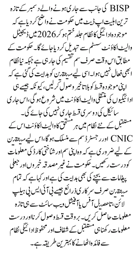 but the current year’s system remains active only for the ongoing installment. Right now, only SIM distribution is in progress, and the wallet system has not yet started. Due to this shift, beneficiaries are being urged to collect their current installment as early as possible because once payments begin transferring into wallet accounts in 2026, the second installment of this ongoing cycle will not be released. In simple terms, beneficiaries should not delay their payment collection because the government has made it clear that the structure of installments will be different in the future. The upcoming system aims to bring transparency, security, and speed, but until it launches, beneficiaries must secure their current funds without waiting for the next cycle. This update is especially important for families depending on their BISP income for essential needs, as any delay may interrupt their financial support.