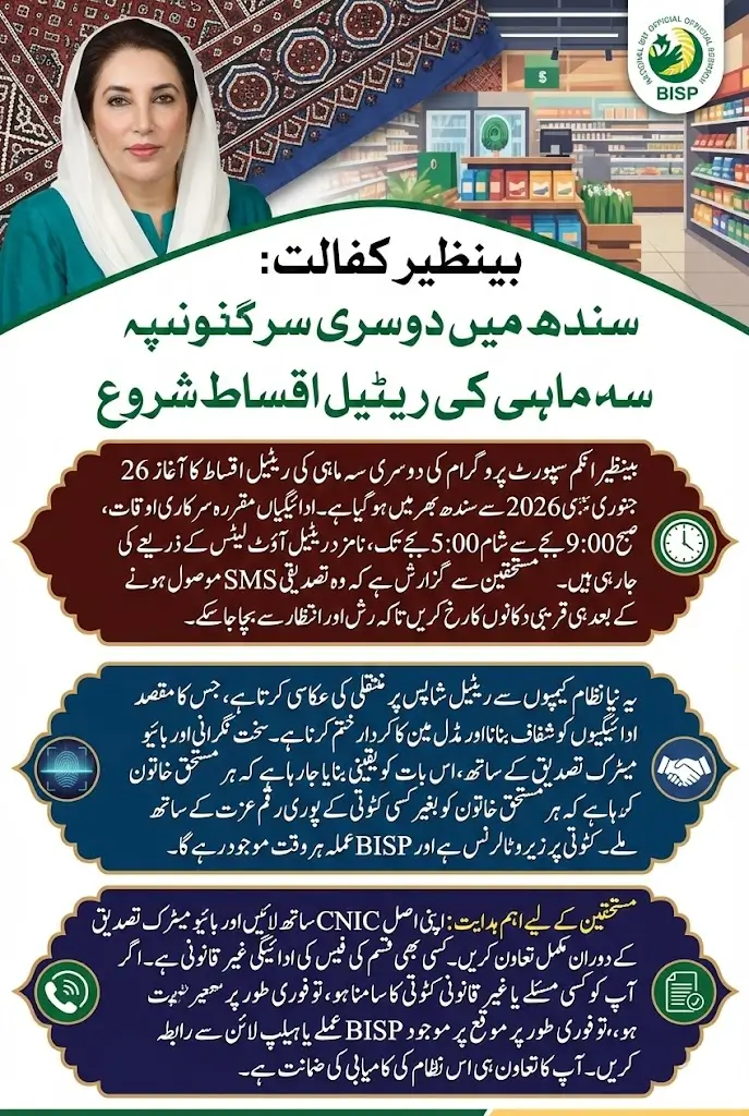 The start of BISP Kafalat Quarter II retail installments in Sindh from 26 January 2026 marks an important step toward a more transparent and beneficiary-friendly payment system. With officers deployed on ground, fixed duty timings, and strict reporting requirements, BISP aims to ensure that payments reach deserving women without delays or deductions.