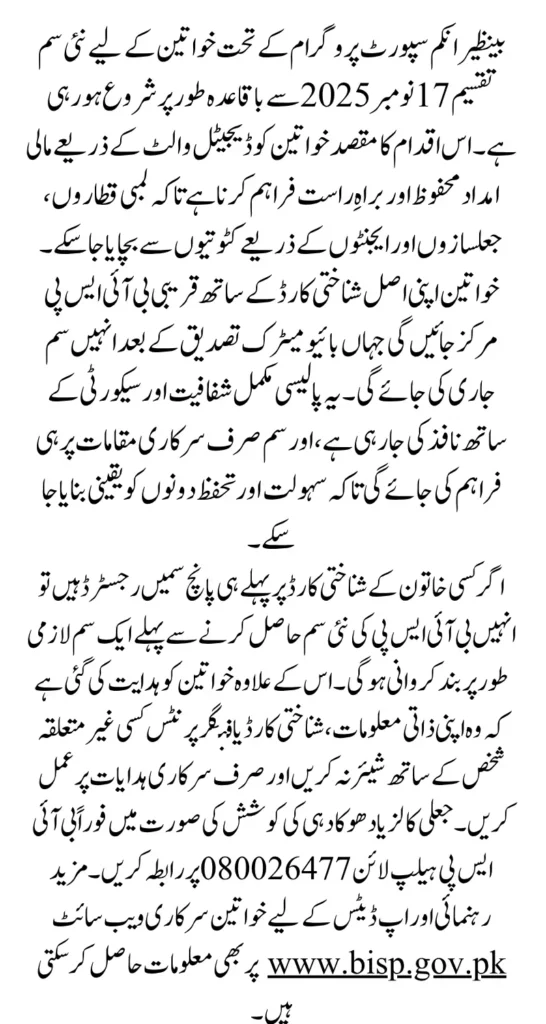 BISP New SIM Distribution Starts has taken another major step toward strengthening digital financial inclusion for women across Pakistan. Starting from November 17, 2025, the government will begin issuing dedicated SIM cards to verified female beneficiaries. This initiative is designed to support the upcoming rollout of digital wallet payments, which will allow beneficiaries to receive assistance securely and directly through mobile banking channels. The program will operate in phases at the tehsil level to ensure smooth management, crowd control, and transparent digital access for deserving households.