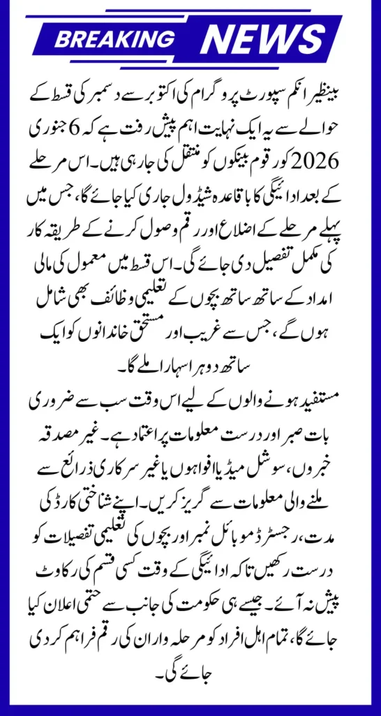 One of the most significant points in this update is the confirmation that BISP funds for the October–December period will be sent to banks on January 6, 2026, Insha’Allah. This transfer means the government will release funds to designated banks so they can begin operational preparations for payments across districts.