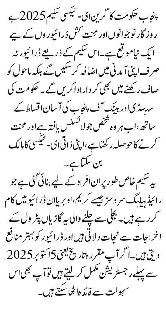 The program, launched under the leadership of Chief Minister Maryam Nawaz, aims to encourage drivers to adopt electric vehicles that are cheaper to run, eco-friendly, and easier to maintain. With government subsidy and support from the Bank of Punjab, applicants can now own a taxi without paying heavy upfront costs. However, time is limited because the final date for registration is October 5, 2025. Those who do not apply before the deadline will miss this valuable opportunity.
