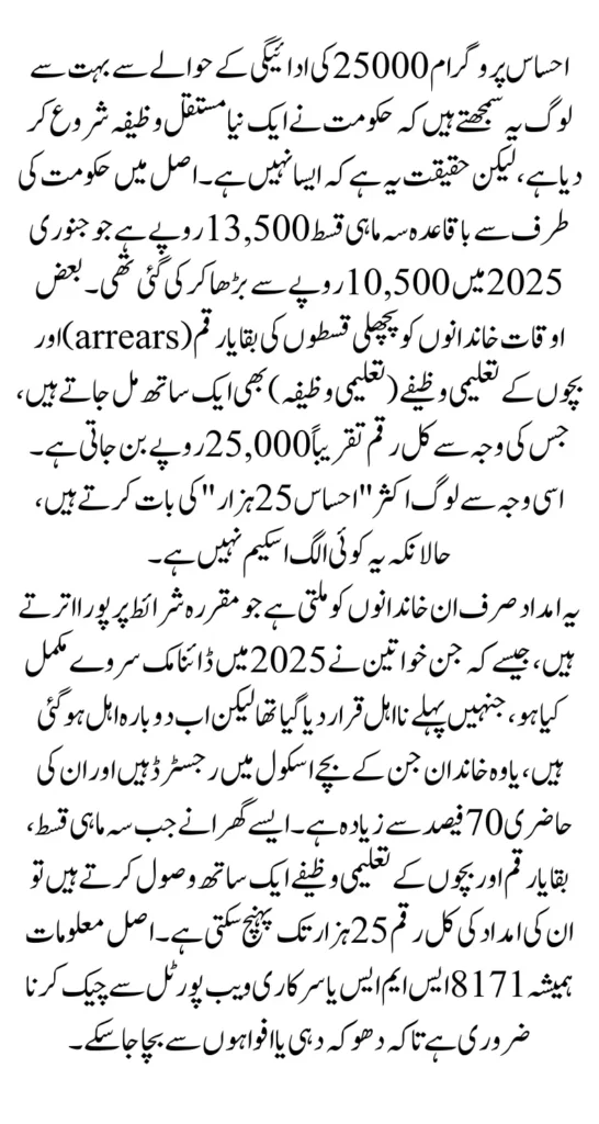 When all these parts are released together, the amount can be around Rs 25,000. This is why people commonly hear about the “Ehsaas 25,000” but in reality, it is not a separate grant. Families should rely only on the official 8171 system to confirm what portion they are eligible for.