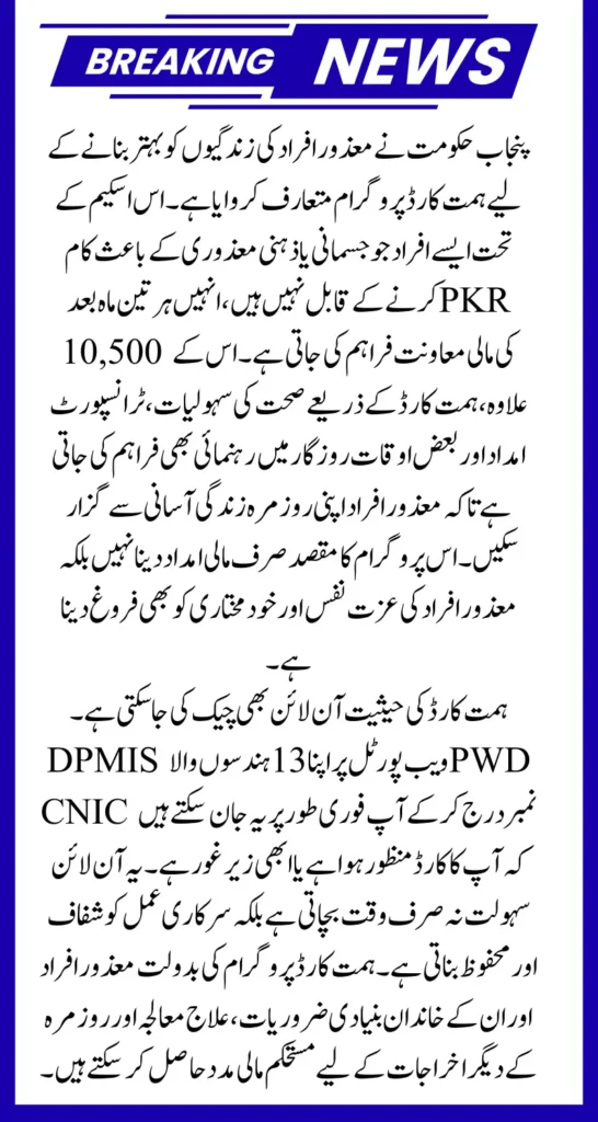 Himmat Card Online Check Status Punjab Government has introduced the CM Himmat Card program, a revolutionary initiative aimed at improving the lives of Persons with Disabilities (PWDs) in the province. This program is specifically designed to provide financial support, health assistance, transport aid, and employment help to individuals who are unable to work due to physical or mental disabilities. The government has ensured that this support reaches the beneficiaries directly through an ATM-based Himmat Card, which deposits PKR 10,500 every three months.
