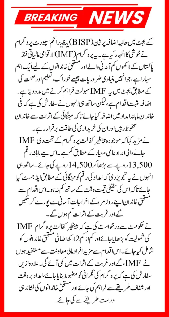 IMF Expresses Satisfaction Over BISP Budget Expansion International Monetary Fund (IMF) has recently expressed satisfaction over the Pakistani government’s decision to increase the budget of the Benazir Income Support Program This program has been a crucial lifeline for millions of low-income families across Pakistan, providing them with cash assistance to meet basic needs such as food, education, and healthcare. IMF officials have welcomed the budget expansion but have also called for further improvements to ensure that the program delivers maximum benefits to deserving families.