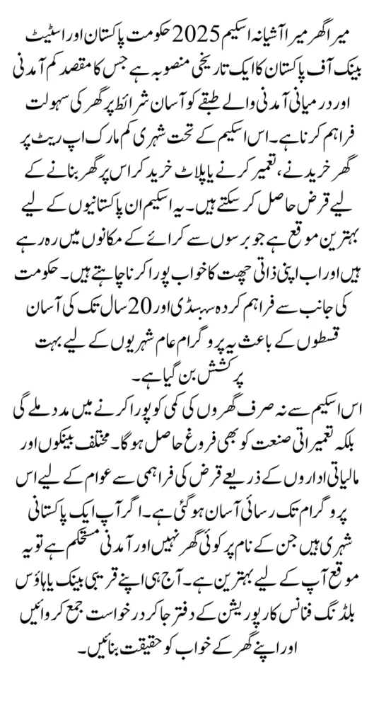 The Mera Ghar Mera Ashiana Scheme 2025 is a major step by the Government of Pakistan and the State Bank of Pakistan to make housing affordable for all. It provides a realistic path for low and middle-income citizens to own a home without facing unbearable financial pressure. With low markup rates, flexible repayment options, and risk-sharing guarantees, this scheme gives thousands of families hope to secure a better and more stable future.