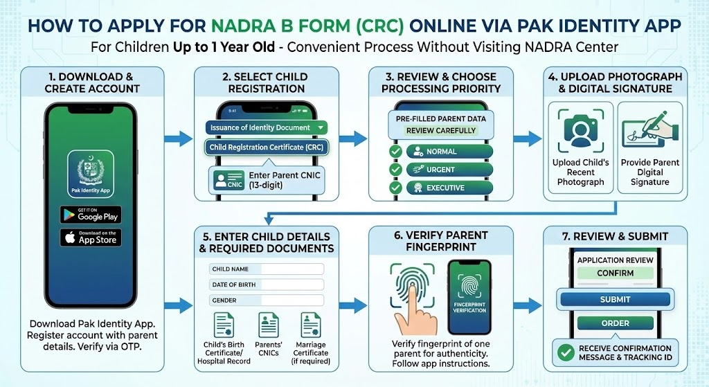 Parents in Pakistan can now conveniently apply for a B Form (Child Registration Certificate – CRC) online using the Pak Identity mobile app for children up to one year old. This mobile application allows parents to submit the application without visiting a NADRA center, saving time and effort.