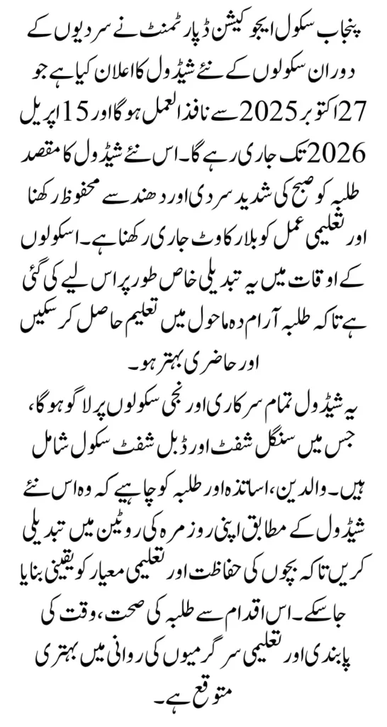 Punjab Schools Introduce New Winter Timings Education Department has issued an official notification regarding new winter timings for schools across the province. These timings are designed to adjust school schedules according to the shorter winter days and colder mornings, ensuring that students can attend classes safely and comfortably. The revised schedule will be implemented from 27 October 2025 and will remain in effect until 15 April 2026.