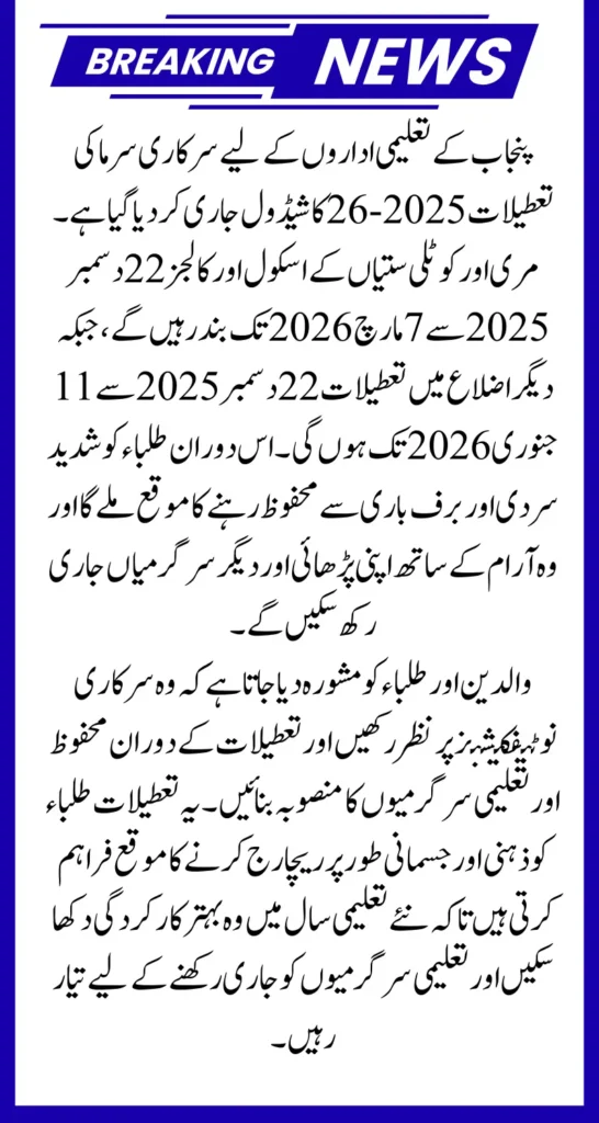 For the rest of Punjab, a standard winter vacation has been announced for public and private schools. These holidays give students across the province a chance to rest while keeping the academic calendar on track.