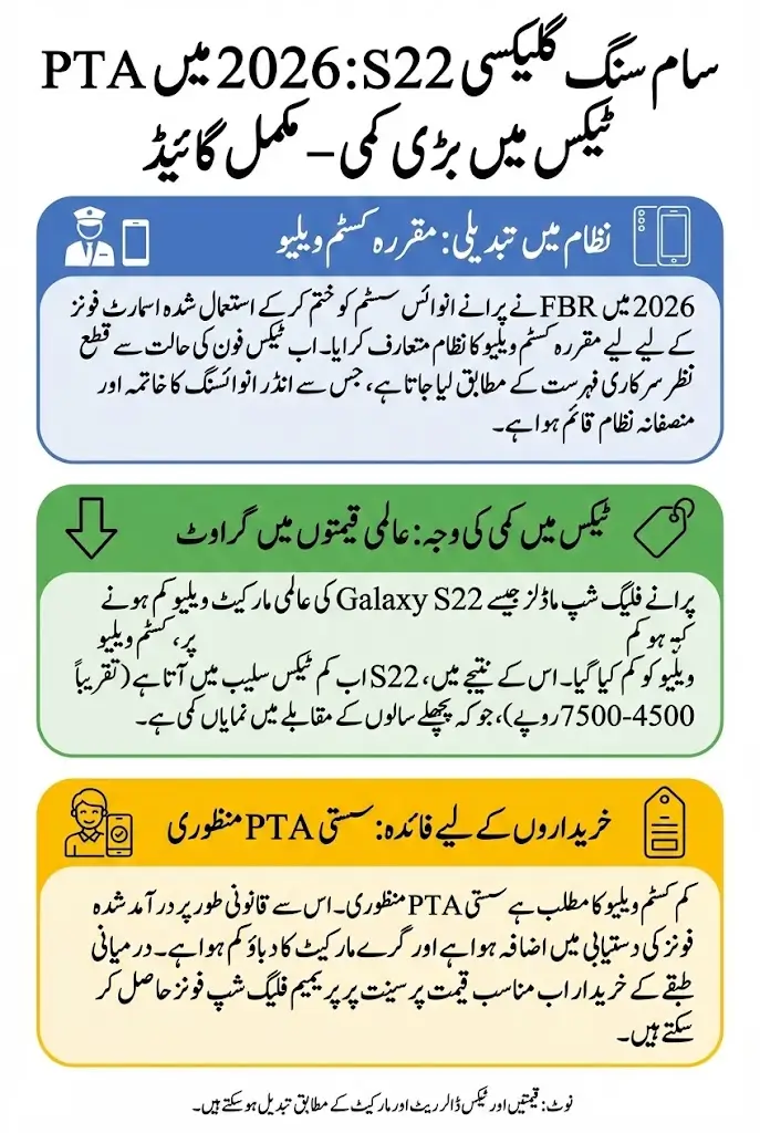Because older flagship phones like Galaxy S22 are now considered depreciated devices globally, their official customs value has been reduced. When customs value decreases, PTA tax slab automatically becomes lower. This is the main reason why tax looks reduced in 2026.