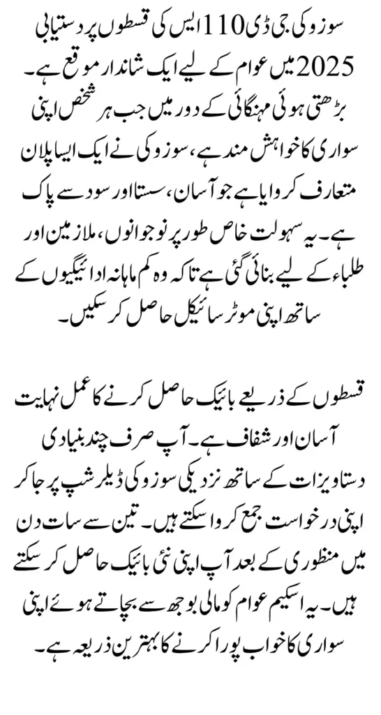 Buying a bike on installments provides financial relief while giving you immediate access to your own transportation. The Suzuki GD 110S installment plan brings multiple advantages for customers in 2025.